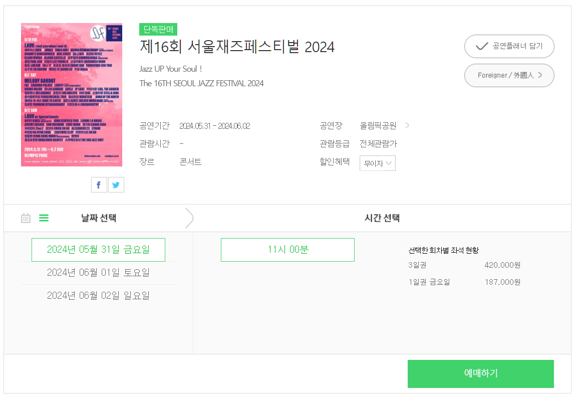 서울재즈페스티벌2024 티켓은 1일권 일반가 187,000원에 장애인은 50% 할인 적용이 되니 아래를 참고하세요.
